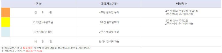 | 구분 | 정회원 | 가족회원 | 주중회원 | 주중지정회원 | 비회원 |